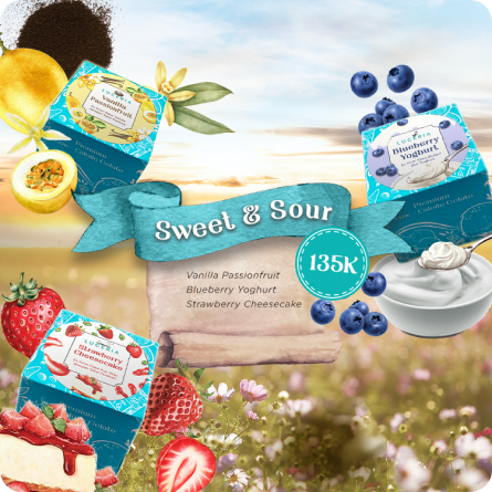• Sweet & sour (Blueberry Yogurt, Strawberry Cheesecake, and Vanilla Passionfruit)